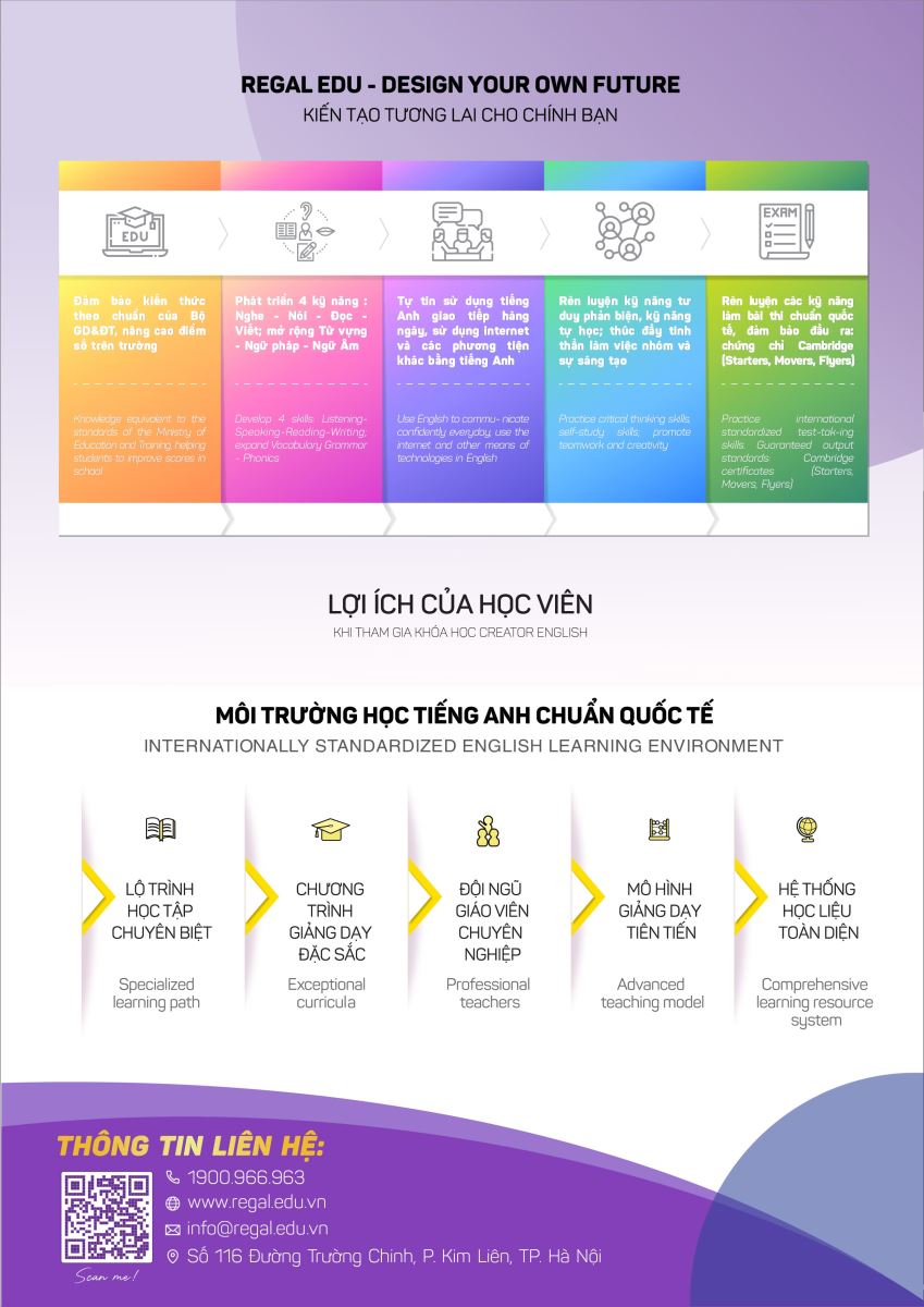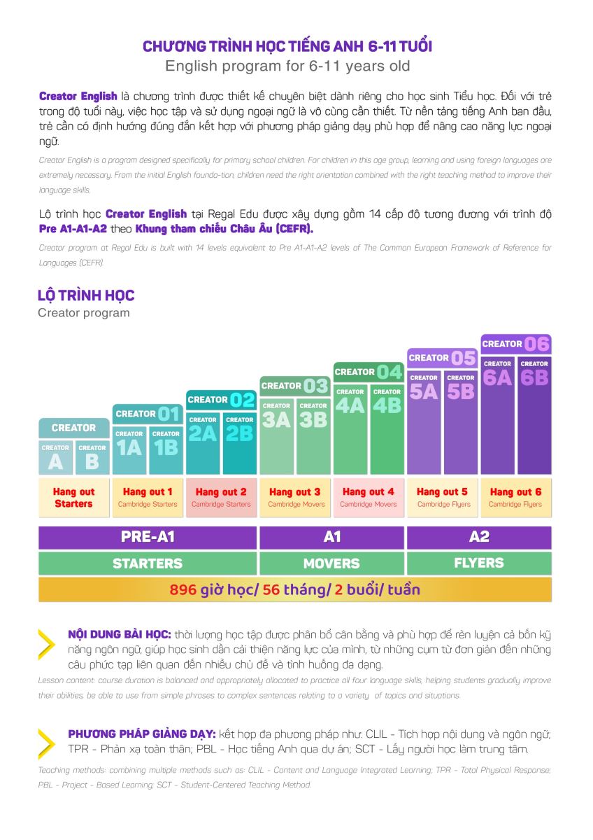 Creator English là chương trình được thiết kế chuyên biệt dành riêng cho học sinh Tiểu học. Đối với trẻ trong độ tuổi này, việc học tập và sử dụng ngoại ngữ là vô cùng cần thiết. Từ nền tảng tiếng Anh ban đầu, trẻ cần có định hướng đúng đắn kết hợp với phương pháp giảng dạy phù hợp để nâng cao năng lực ngoại ngữ.
