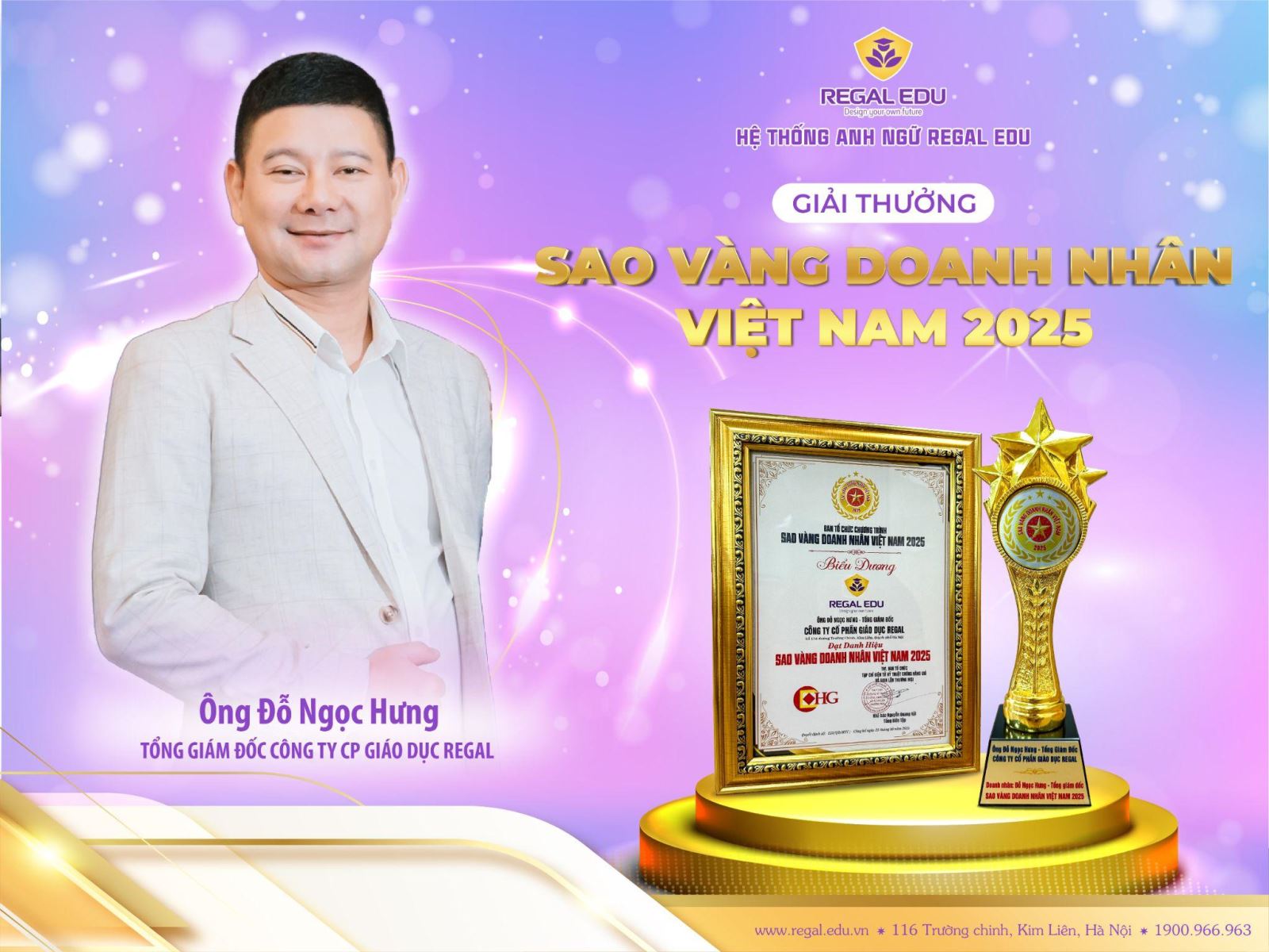 Vừa qua, tại Lễ tôn vinh Sao Vàng Doanh Nhân & Thương Hiệu Việt Nam 2025, Hệ thống Anh ngữ Regal Edu được vinh danh Top 10 Sao Vàng Thương Hiệu Việt Nam, cùng danh hiệu Sao Vàng Doanh Nhân Việt Nam 2025 dành cho Tổng Giám đốc Đỗ Ngọc Hưng.